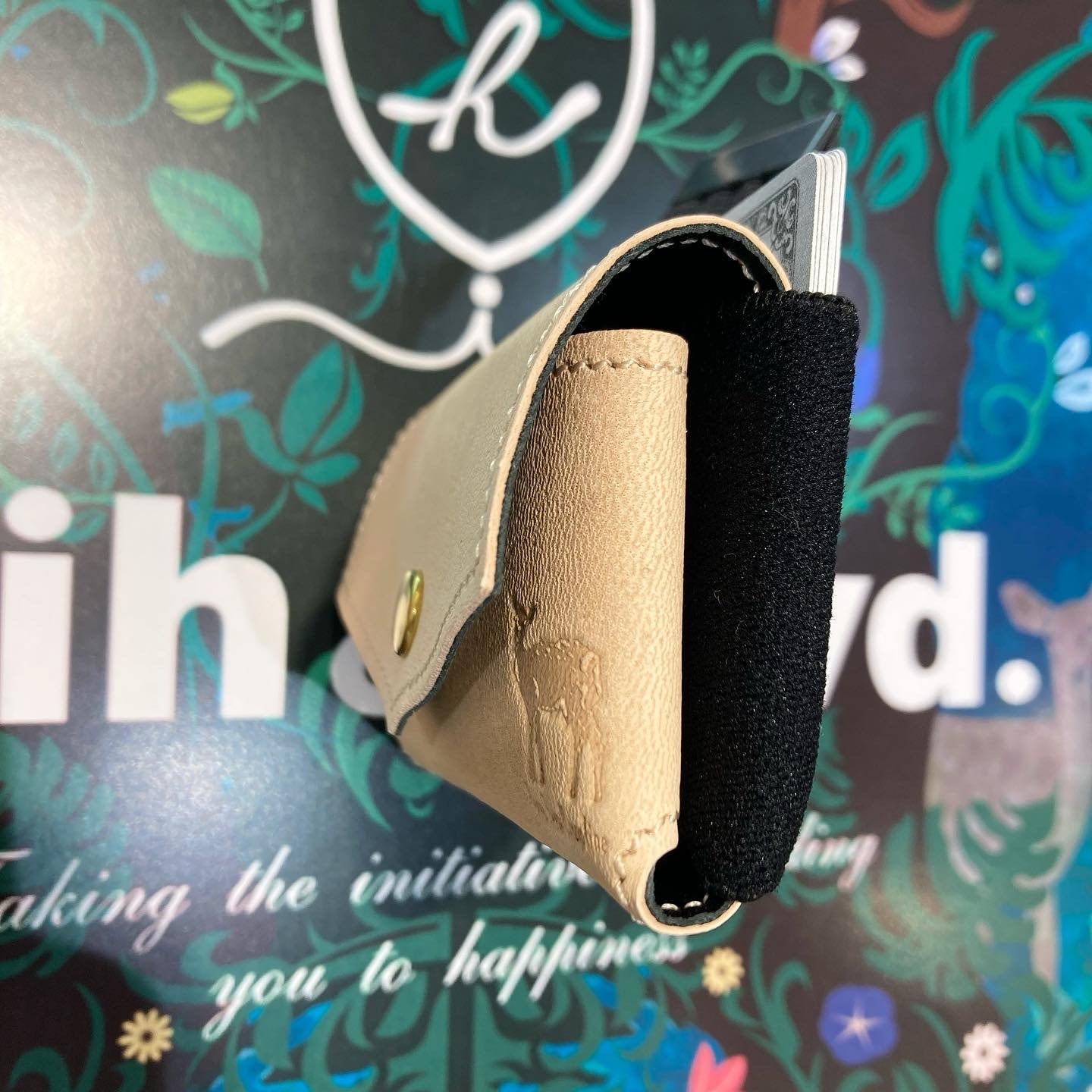 カード収納部のゴムにはスノーボードのゴーグルなどに使われる耐久性の優れたウーリーゴムを使用している為、伸びてだるだるになってしまうこともありません。出し入れのしやすさを損なわず、かつ収納するカードの枚数が少ない時でもしっかりホールドするゴムの長さをミリ単位で調整しました。⠀